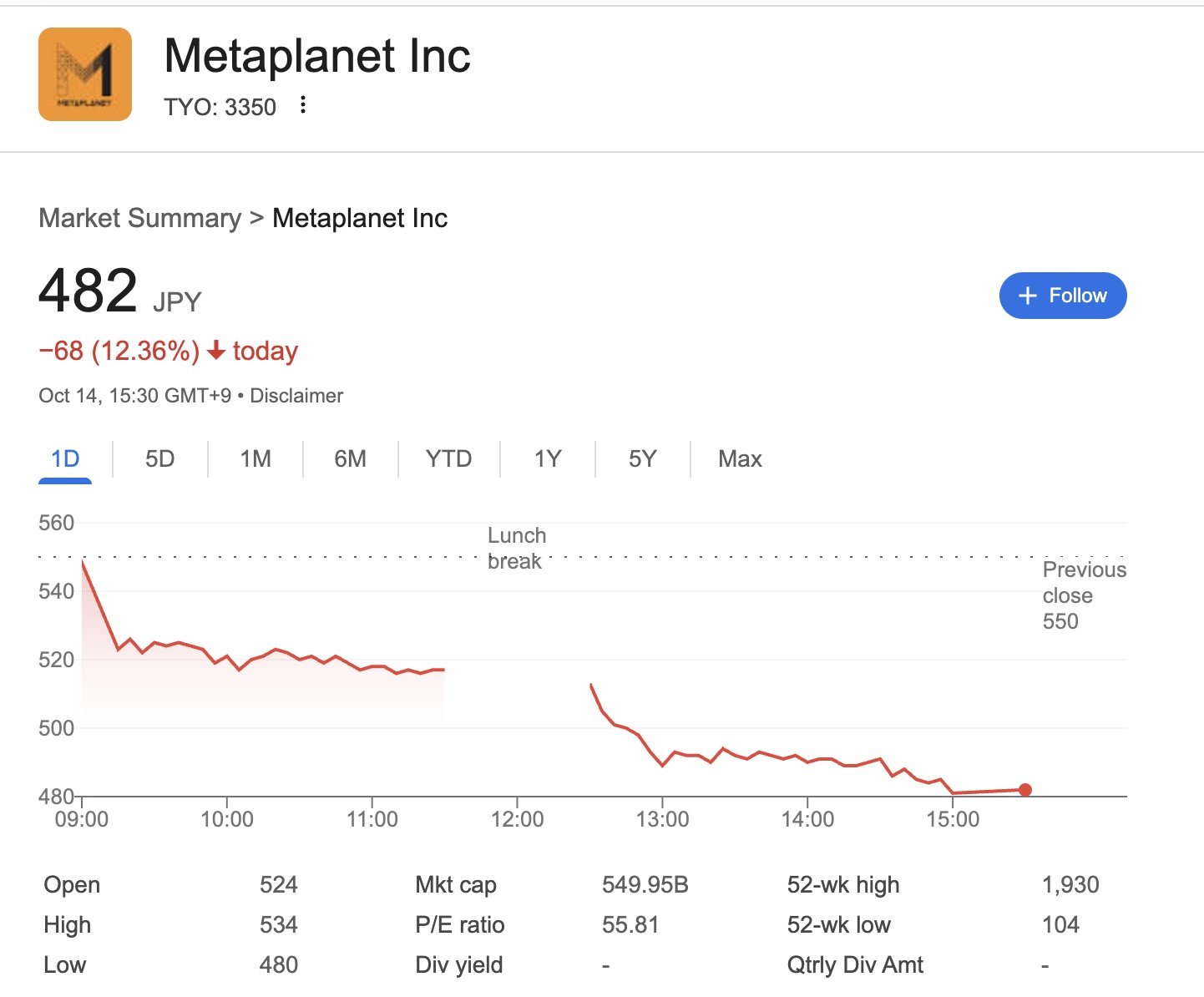 Theo dữ liệu, giá trị doanh nghiệp của công ty niêm yết tại Nhật Bản Metaplanet Inc. hiện đã giảm xuống dưới giá trị lượng Bitcoin mà công ty nắm giữ. Metaplanet bắt đầu chiến lược tích lũy Bitcoin từ tháng 4/2024 và từng giao dịch với mức premium cao so với giá trị tài sản ròng bằng Bitcoin. Tuy nhiên, sau khi đạt đỉnh vào giữa tháng 6, cổ phiếu công ty đã lao dốc khoảng 70%, khiến mNAV giảm còn 0,99 vào thứ Ba.