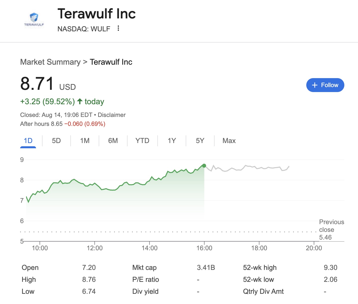 Theo báo cáo tài chính mới nhất, TeraWulf ghi nhận khoản lỗ ròng hơn 79 triệu USD trong nửa đầu 2025. Cổ phiếu công ty hiện giao dịch ở mức 8,40 USD, tăng mạnh so với mức đóng cửa 5,46 USD.