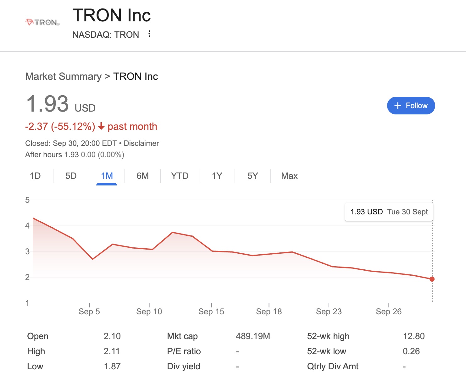 Tron Inc., công ty niêm yết trên Nasdaq thông qua thương vụ sáp nhập ngược với SRM Entertainment hồi tháng 7, đã giảm 85% giá trị cổ phiếu kể từ đỉnh 12,80 USD ngày 20/6. Riêng trong tháng 9, cổ phiếu mất tới 55%, phản ánh xu hướng chung của các doanh nghiệp công khai nắm giữ tài sản số.