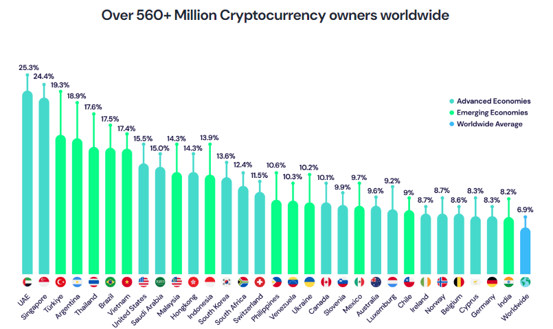 Một nghiên cứu của AAA trong năm nay ước tính có hơn 560 triệu người dùng tiền điện tử trên toàn thế giới trong khi báo cáo của AAA từ năm 2023 cho thấy có khoảng 420 triệu người dùng toàn cầu.