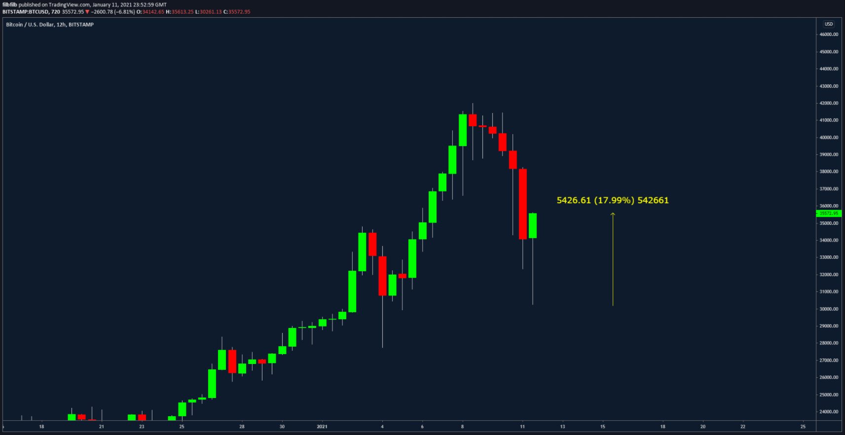 Sự trở lại đánh dấu hiệu suất hàng ngày tốt nhất từ trước đến nay của Bitcoin, cả về đô la Mỹ và tỷ lệ phần trăm. Các con số sẽ được xác nhận sau khi nến hàng ngày đóng cửa, với mức thời gian mức cao nhất địa phương là 36.600 đô la.