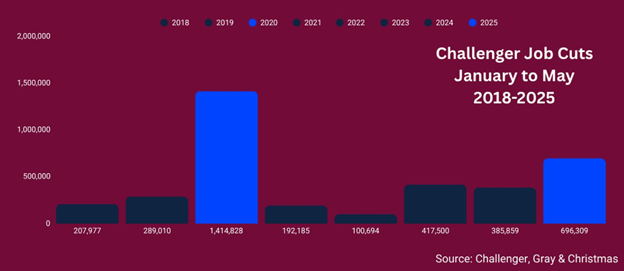 Dữ liệu cũng chỉ ra sự suy thoái của thị trường lao động Hoa Kỳ. Challenger, Gray & Christmas cho biết số lượng sa thải trong tháng 5 năm 2025 đã tăng 47% so với cùng kỳ năm ngoái. Tính đến nay, số lượng cắt giảm công việc đã tăng đến 80% so với năm 2024.