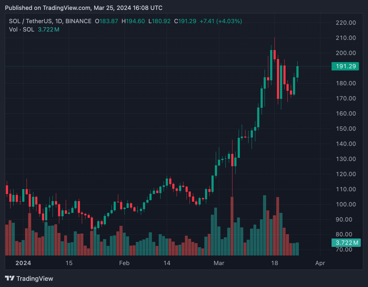 Memecoin và các token có chủ đề chính trị có thể đã góp phần giúp Solana nổi lên như một sản phẩm được yêu thích trong số những người dùng đang quay cuồng vì chi phí giao dịch cao trên blockchain Ethereum. Chu kỳ đang diễn ra đã chứng kiến nhu cầu về Solana tăng đột biến, bằng chứng là các số liệu onchain và TVL. Trong khi đó, vốn hóa thị trường SOL đã phá vỡ mức cao nhất mọi thời đại trên 87 tỷ USD vào ngày 19 tháng 3.