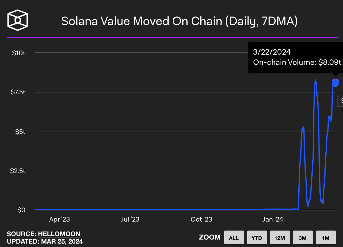 Giá trị SOL được di chuyển onchain – đại diện cho tiện ích và nhu cầu về blockchain của những người tham gia thị trường – đã vượt qua 8,09 nghìn tỷ USD vào ngày 22 tháng 3, đánh dấu mức cao nhất gần hai năm.