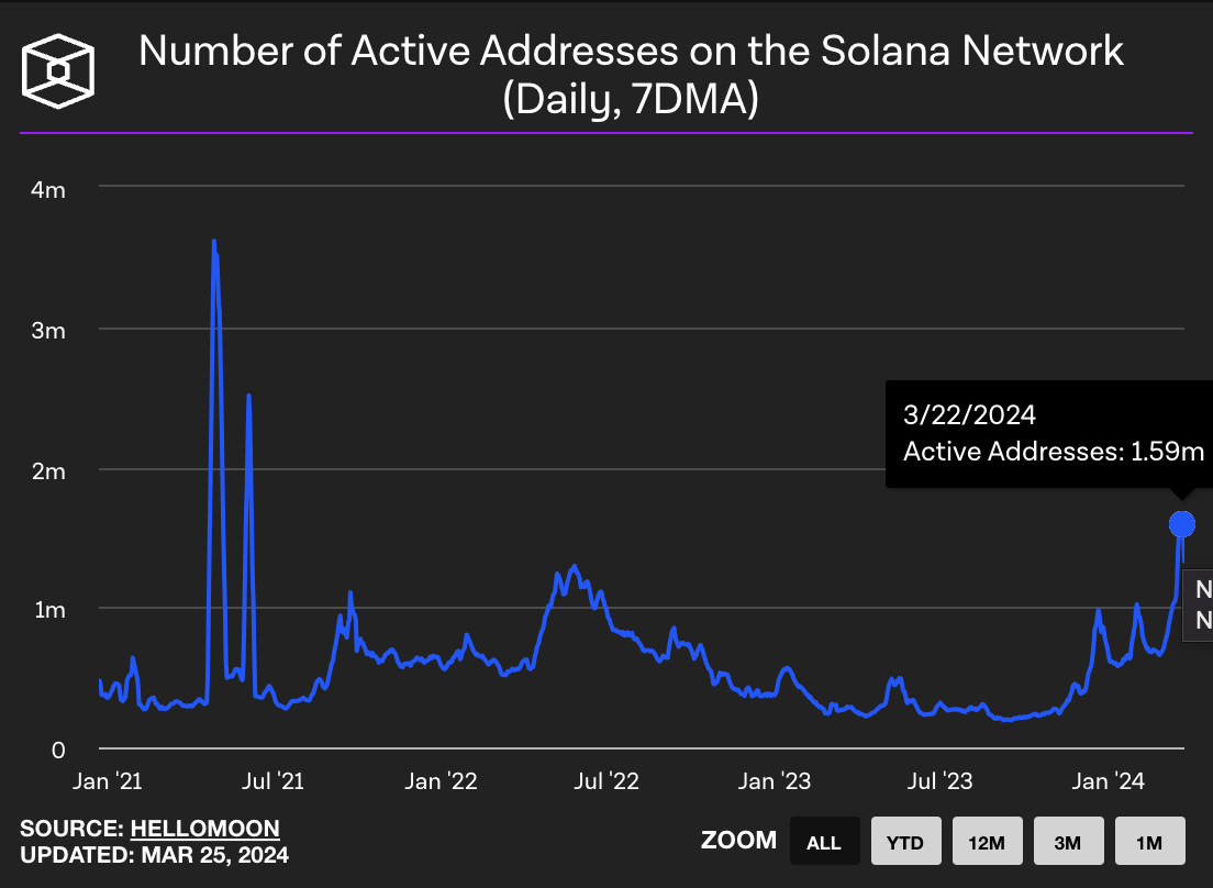 Hoạt động của địa chỉ là biểu hiện của tiện ích của mạng blockchain. Sự gia tăng số lượng địa chỉ mới và đang hoạt động có thể là do nhu cầu về memecoin và tài sản dựa trên Solana tăng vọt.