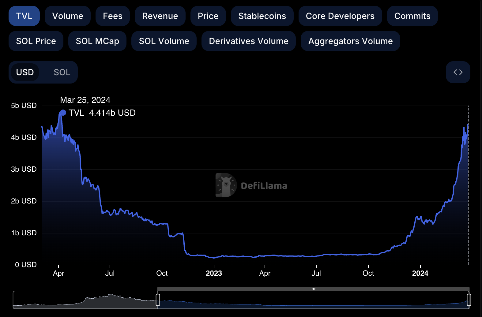 Các số liệu onchain tăng giá xuất hiện vào thời điểm TVL của blockchain Solana đạt mức cao mới là 4,41 tỷ USD kể từ ngày 5 tháng 4 năm 2022.