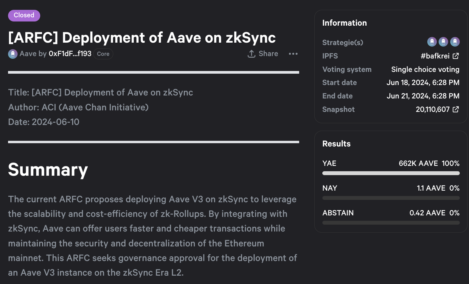 Đề xuất AFRC (Aave Formal Request for Comments), được khởi xướng bởi Aave Chan Initiative, nhận được sự ủng hộ từ cộng đồng với 662.000 phiếu thuận ‘Có’. Điều này cho thấy sự hậu thuẫn mạnh mẽ cho việc tích hợp Aave với ZKsync.