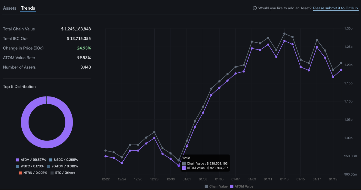 Theo dữ liệu từ Mintscan, Tổng giá trị chuỗi (Total Chain Value) của hệ sinh thái Cosmos đã vọt lên 1,24 tỷ USD vào thứ Hai, tăng mạnh so với mức 938,5 triệu USD ghi nhận ngày 31/12. Đáng chú ý, hơn 99% giá trị này đến từ token ATOM, trong khi Inter-Blockchain Communication (IBC) lại chứng kiến dòng vốn rút ròng khoảng 13,71 triệu USD khỏi blockchain.