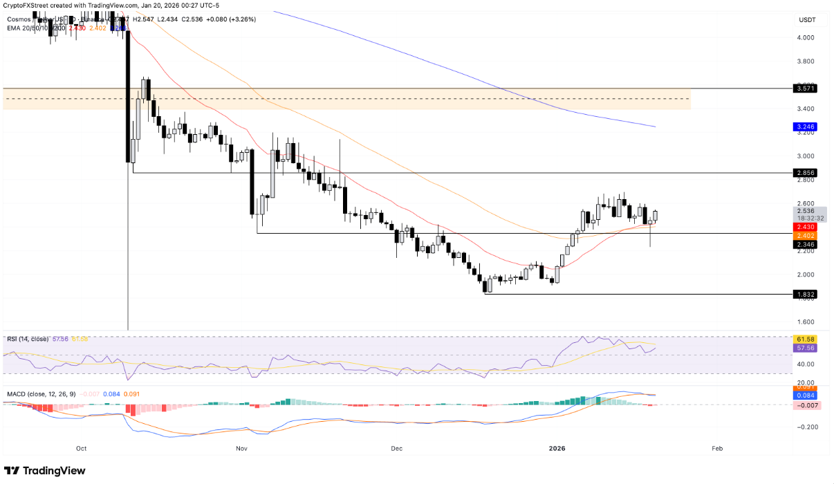 Cosmos (ATOM) đang dao động quanh mốc 2,50 USD tại thời điểm viết bài vào thứ Ba, tiếp tục giữ vững vị thế phía trên Đường trung bình động hàm mũ (EMA) 20 ngày. Đà tăng đều đặn của dòng vốn chảy vào mạng lưới, cùng với sự mở rộng của hợp đồng mở (OI) trên thị trường hợp đồng tương lai ATOM, phản ánh nhu cầu on-chain đang cải thiện và sự tham gia ngày càng tích cực của nhóm nhà đầu tư nhỏ lẻ. Dẫu vậy, bức tranh kỹ thuật của ATOM vẫn mang sắc thái giằng co, khi các chỉ báo quan trọng chưa phát đi tín hiệu xác nhận xu hướng tăng bền vững và rủi ro điều chỉnh giảm vẫn chưa được loại bỏ.