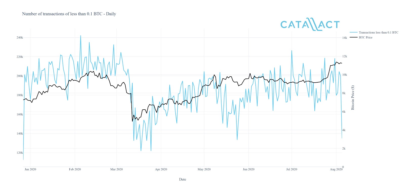 Nghiên cứu xem xét dữ liệu giao dịch on-chain BTC từ tháng 1 đến đầu tháng 8 năm 2020, cho thấy các nhà đầu tư bán lẻ phần lớn đã rút lui và chờ đợi cơ hội mới với Bitcoin. Mặt khác, các nhà đầu tư tổ chức lớn hơn thì lại tích lũy Bitcoin. Báo cáo không tính đến các giao dịch trong tháng 8 và tháng 9 khi giá giảm.