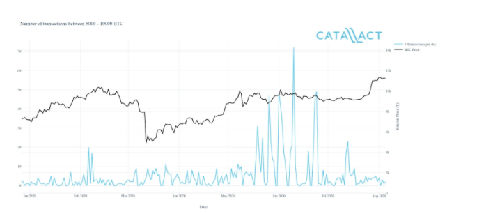 Số lượng giao dịch từ 5.000 đến 10.000 BTC đã tăng đáng kể trong suốt mùa hè hợp nhất giá của Bitcoin | Nguồn: Catallact