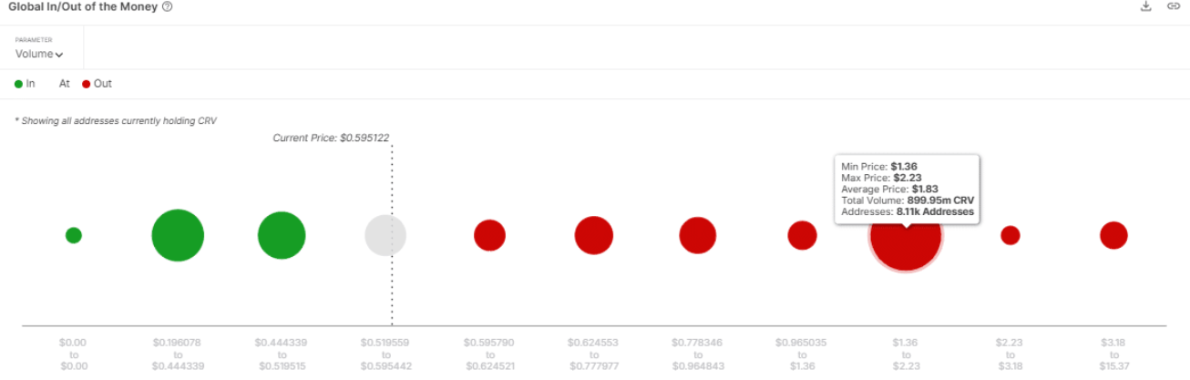 Chỉ báo In/Out of the Money Around Price (IOMAP) hiện cho thấy mức kháng cự phía trước tương đối yếu, hàm ý rằng giá CRV còn dư địa tăng trưởng trong ngắn hạn.