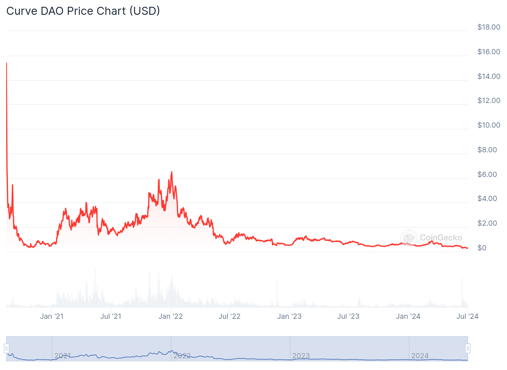 Cùng ngày thanh lý Egorov, CRV giảm xuống mức thấp nhất mọi thời đại là 0,239 USD. Hiện tại, CRV đang giao dịch ở mức 0,28 USD và hiện giảm 98,2% so với mức cao nhất mọi thời đại là 15,37 USD.