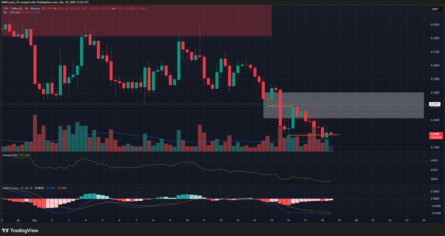 Trước khi tiếp cận vùng giá này, CRV nhiều khả năng sẽ phản ứng tại các ngưỡng hỗ trợ ngắn hạn lần lượt ở 0,329 USD và 0,298 USD — những khu vực có thể tạm thời kìm hãm áp lực bán và làm chậm nhịp điều chỉnh của giá.