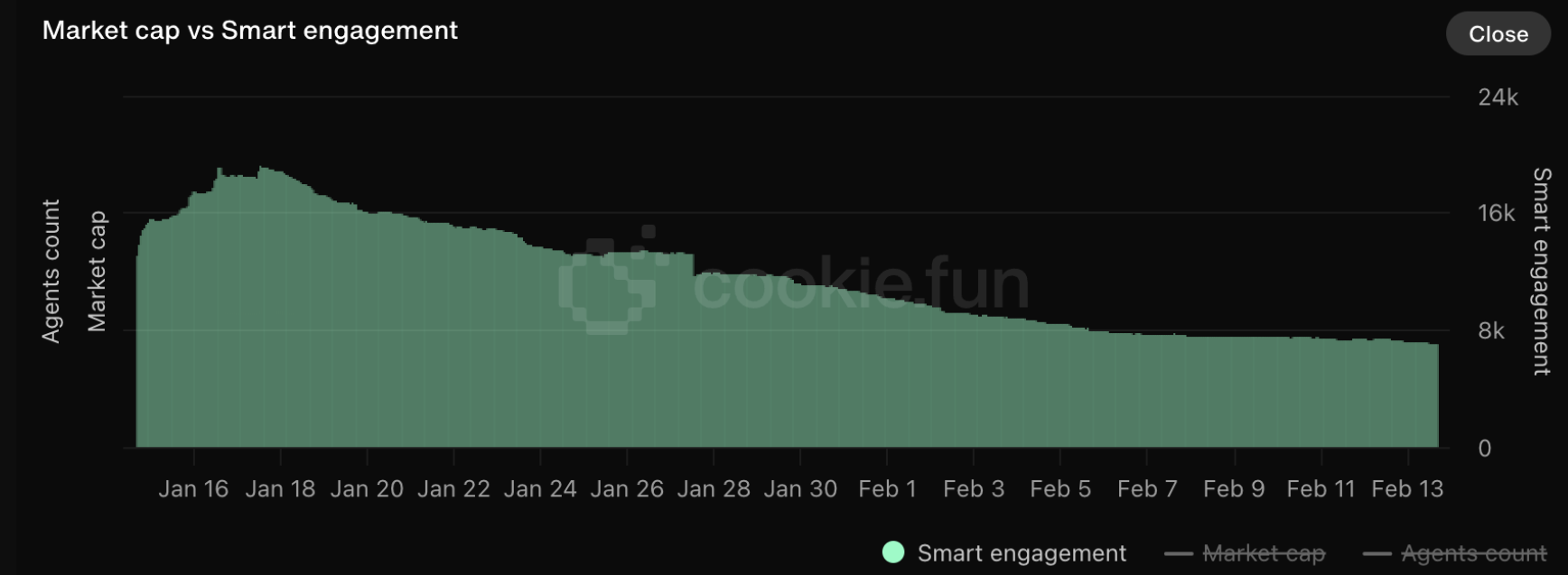 Mức độ tham gia của các tài khoản thông minh trên Crypto AI Agents – những ví được liên kết với các KOL hoặc smart trader – đã giảm đều đặn kể từ ngày 27/1. Những tài khoản này đóng vai trò quan trọng trên thị trường, vì chúng thường phản ánh sự tập trung của các nhà đầu tư giàu kinh nghiệm.