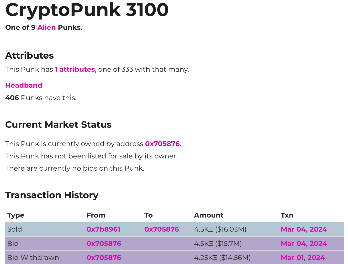 CryptoPunk #3100, một trong chín “Alien Punks”, được bán với giá 4.500 ETH trị giá 16,03 triệu USD.