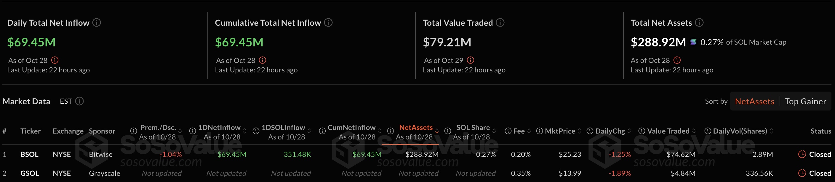 Ngày 28/10, Bitwise Solana Staking ETF (mã BSOL) chính thức giao dịch, thu hút 69 triệu USD dòng tiền ngay ngày đầu, mức cao nhất trong số khoảng 850 ETF ra mắt trong năm 2025, theo dữ liệu từ SosoValue.