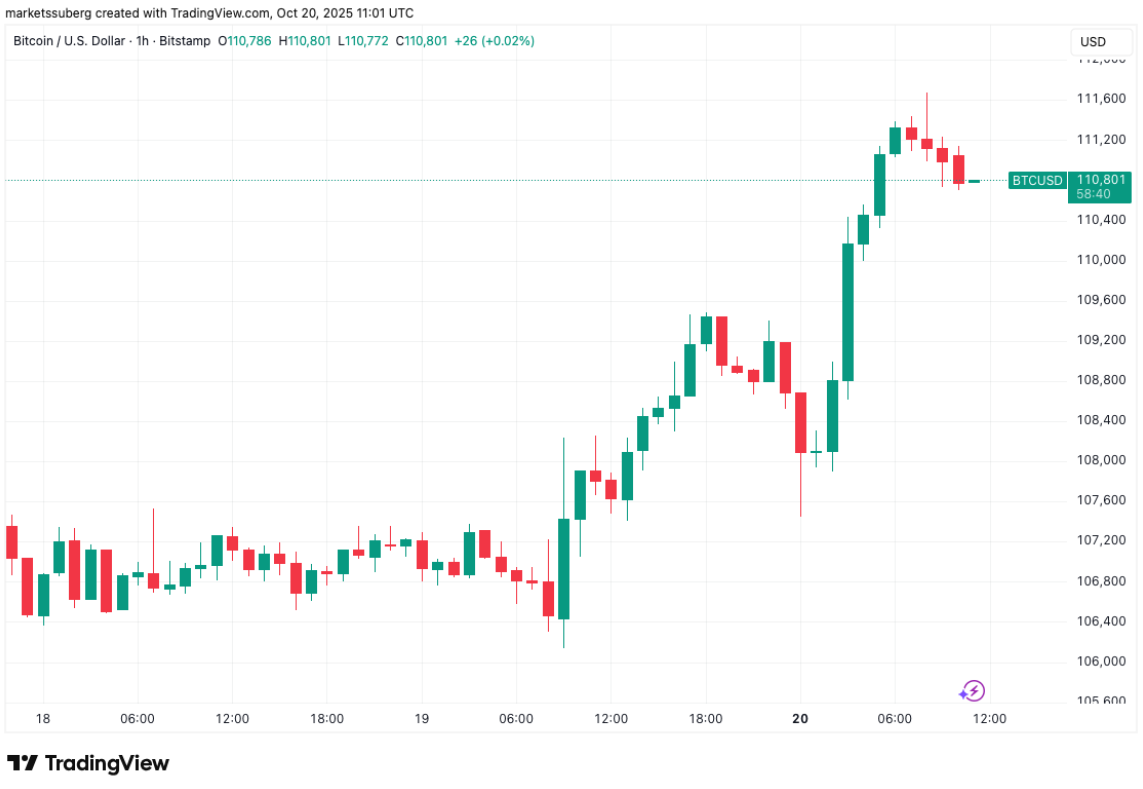 Dữ liệu từ TradingView cho thấy lực mua quay trở lại trong phiên giao dịch đầu tuần tại châu Á, giúp BTC vọt lên mức 111.000 USD. Giới giao dịch gần như đồng thuận rằng biến động sẽ còn gia tăng trong những ngày tới.