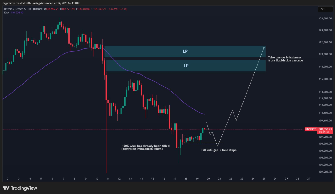 Như Coin Photon từng đưa tin, RSI khung 4 giờ đã xuất hiện phân kỳ tăng sau cú rơi xuống 102.000 USD trên sàn Binance. Tuy nhiên, phần lớn trader vẫn kỳ vọng thị trường sẽ quay lại “lấp” phần bóng nến còn lại.