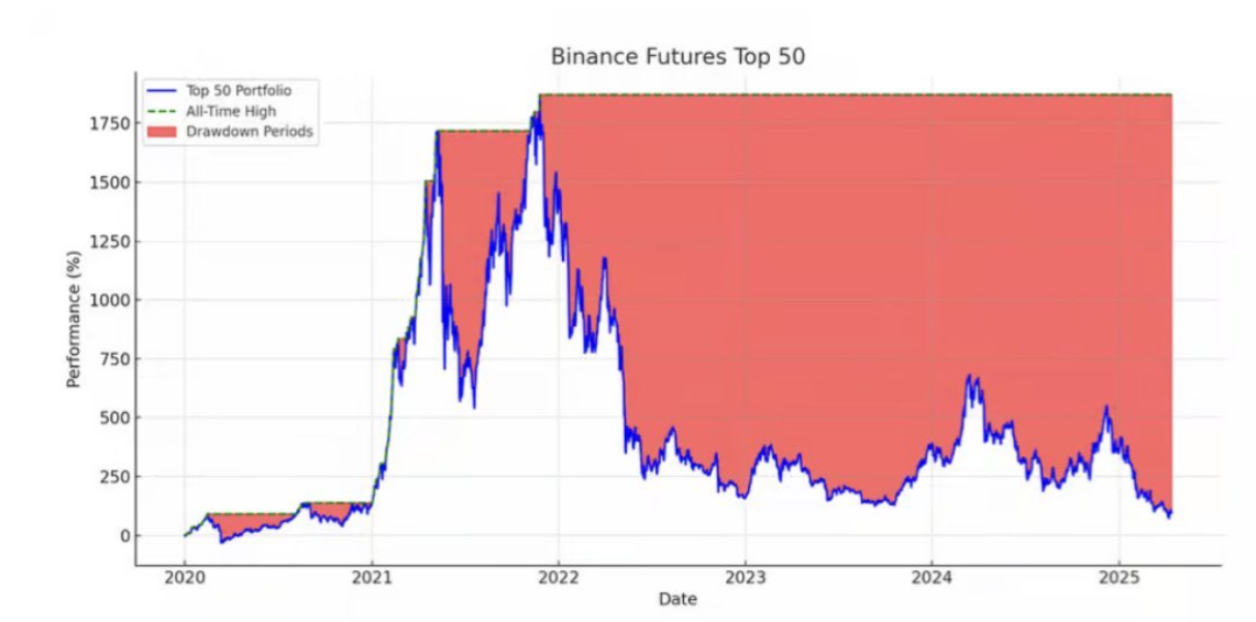 Ngoài ra, Rekt Capital cảnh báo: nếu mốc 57,68% (vùng hỗ trợ màu xanh lá) bị phá vỡ, đó có thể là tín hiệu mở đầu cho altseason – mùa tăng giá mạnh của altcoin. Minh chứng rõ ràng cho sức ép của altcoin là rổ 50 hợp đồng tương lai altcoin hàng đầu trên Binance vẫn giao dịch dưới mức từng ghi nhận trước đáy thị trường gấu năm 2022.