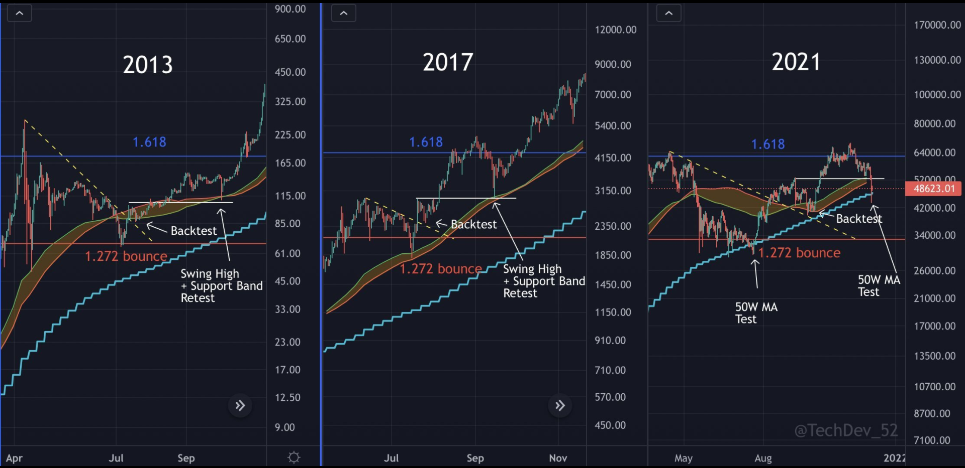 Một trong số chúng đã được nhà phân tích @TechDev_52 công bố vào ngày hôm qua trên Twitter. Ông so sánh các khía cạnh kỹ thuật trong cấu trúc fractal của chu kỳ hiện tại và hai chu kỳ trước đó. Trong mọi trường hợp, giai đoạn thú vị là khi giá đạt đến ngưỡng kháng cự vĩ mô tại đường Fib thoái lui bên ngoài 1.618, đo lường từ đỉnh của chu kỳ tăng trước đó đến đáy của chu kỳ tiếp theo.
