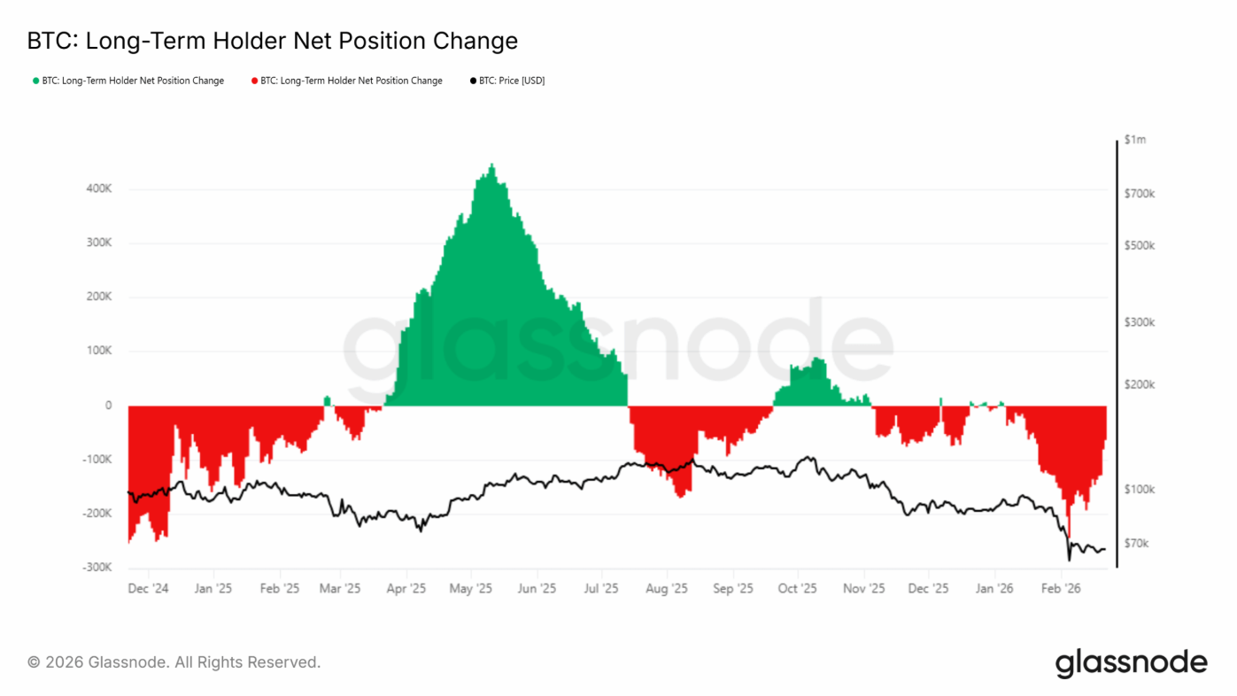 Chỉ số Long-Term Holder Net Position Change phản ánh mức độ biến động nguồn cung trong vòng 30 ngày do các nhà đầu tư dài hạn kiểm soát — những người nắm giữ BTC tối thiểu 155 ngày. Cú lao dốc mạnh vào ngày 5/2 cho thấy khoảng 244.866 BTC đã bị rút khỏi nguồn cung của nhóm này, một tín hiệu đáng chú ý về sự thay đổi trong hành vi nắm giữ.