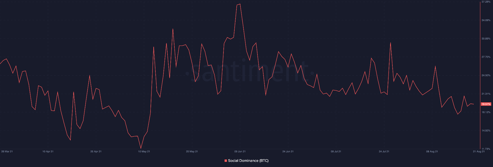 Giá Bitcoin đã cố gắng phục hồi kể từ ngày 20/7 nhưng đôi khi thị trường không có bất kỳ động lực nào. Mặc dù Bitcoiner có vẻ hào hứng với cuộc biểu tình không thể tránh khỏi, nhưng cần lưu ý tỷ lệ thống trị xã hội của vua tiền điện tử giảm mạnh trong 3 tuần qua.