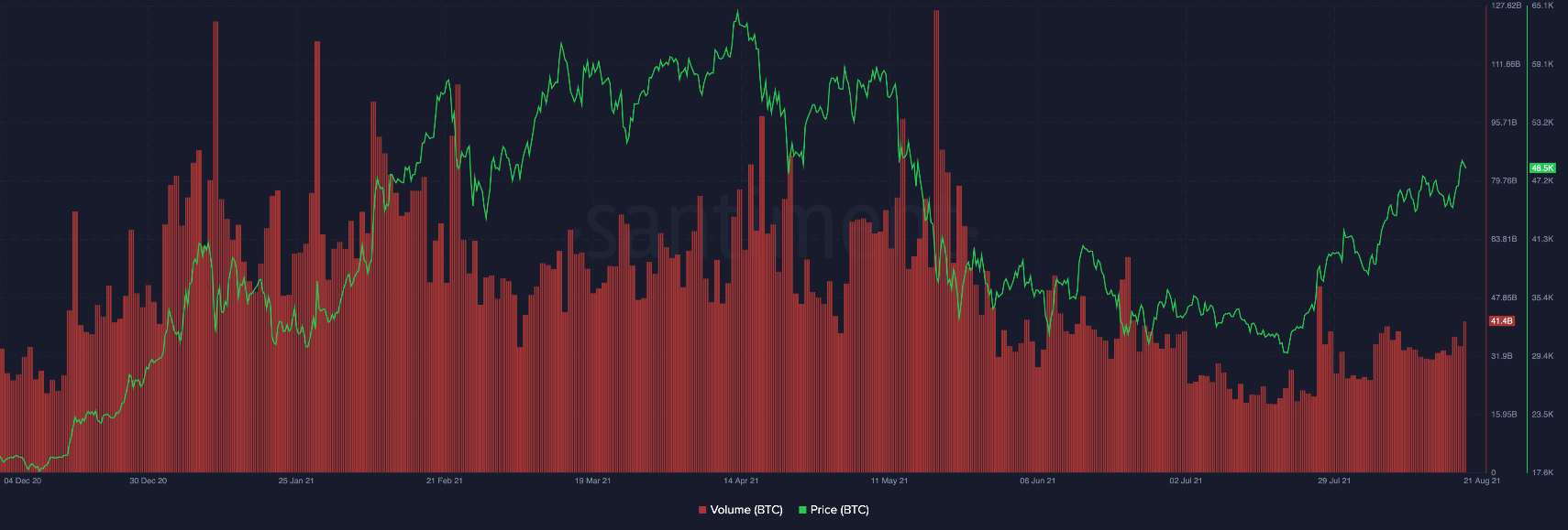 Khối lượng (đỏ) và giá BTC (xanh) | Nguồn: Santiment