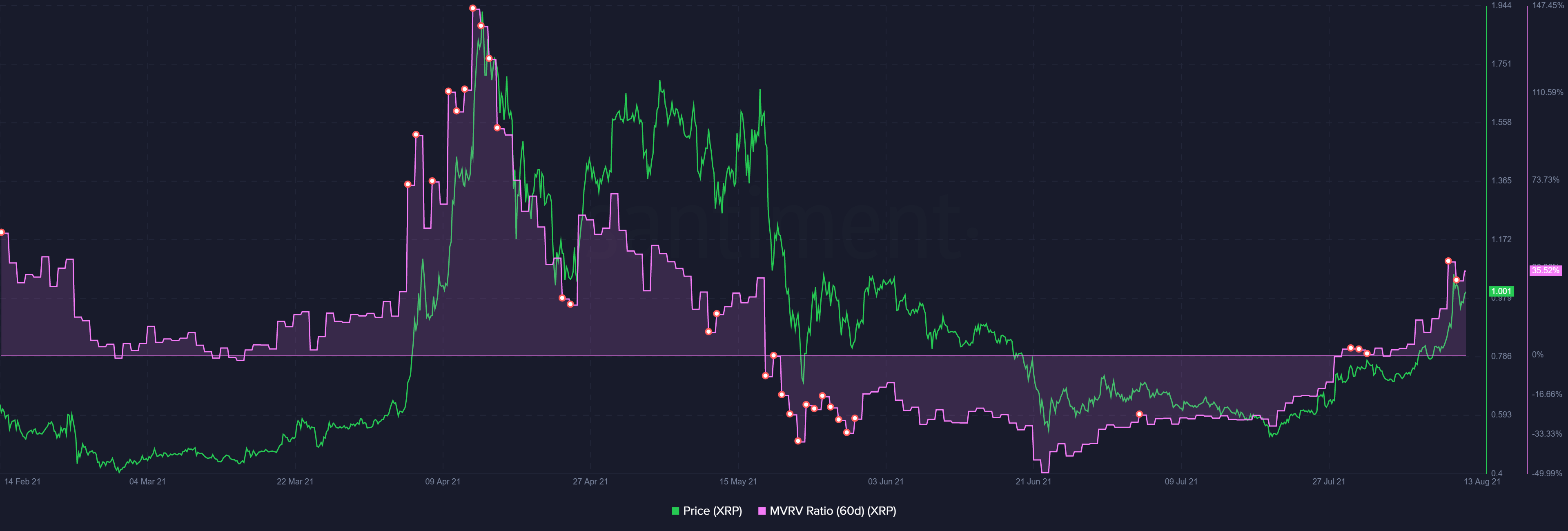 Giá XRP phục hồi một phần nhờ vào chỉ báo MVRV tăng vững chắc (60 ngày). Theo Santiment, chỉ báo cho thấy sự bất thường (giá trị cao) tại thời điểm viết bài. Điều này có nghĩa rằng đây thực tế là một đợt tăng giá và những người nắm giữ dài hạn cuối cùng cũng có được lợi nhuận. Giá trị MVRV cho alt hiện ở mức của ngày 15/5 khi XRP đạt đỉnh.
