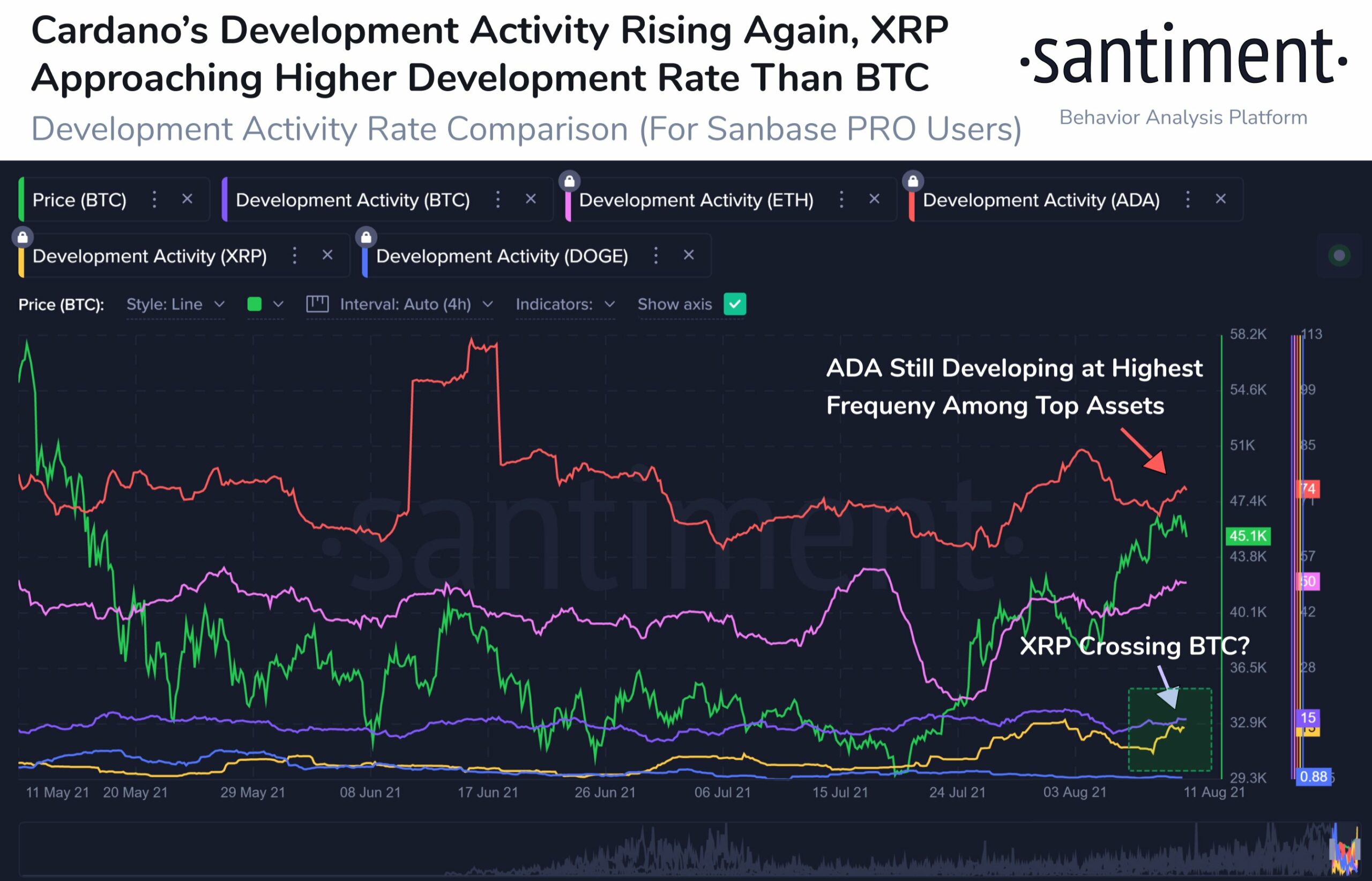 Một tweet của Santiment nhấn mạnh tỷ lệ hoạt động phát triển cho các loại tiền điện tử hàng đầu chỉ ra sự thống trị liên tục của ADA và ETH. Tuy nhiên, điều thú vị là trong một xu hướng chưa từng thấy trước đây, XRP Network đang đạt được tốc độ phát triển Github hàng ngày cao hơn so với Bitcoin, “điều này hiếm khi xảy ra”.