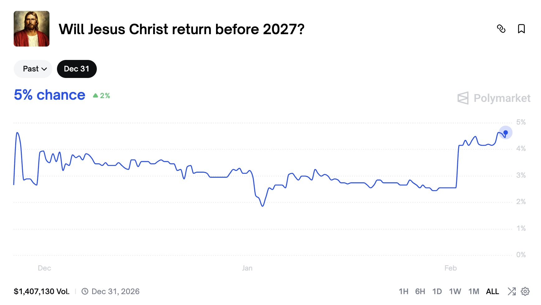 Các trader trên nền tảng dự đoán Polymarket đã đẩy xác suất ngụ ý về việc Chúa Jesus quay trở lại trước cuối năm 2026 lên khoảng 5%, tăng hơn gấp đôi so với đầu tháng 1.