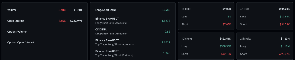 Không chỉ suy yếu trên chuỗi, tâm lý thận trọng cũng đang bao trùm nhóm nhà đầu tư bán lẻ. Dữ liệu từ CoinGlass ghi nhận hợp đồng mở (OI) của hợp đồng tương lai ENA — thước đo tổng giá trị danh nghĩa của toàn bộ vị thế mở — đã giảm 8,65% trong 24 giờ qua, còn 727,49 triệu USD. Điều này cho thấy các trader phái sinh đang dần thu hẹp mức độ tiếp xúc với rủi ro, phản ánh sự dè dặt ngày càng lớn đối với Ethena trong ngắn hạn.