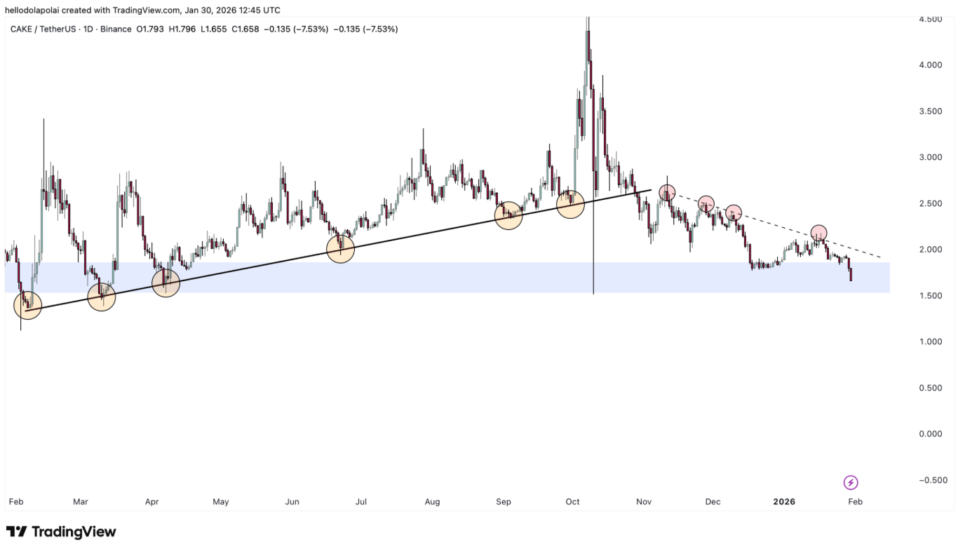 PancakeSwap (CAKE) đang bước vào một trong những chu kỳ suy giảm kéo dài nhất trong nhiều tháng trở lại đây, với đà bán mạnh liên tục đẩy giá trượt sâu.