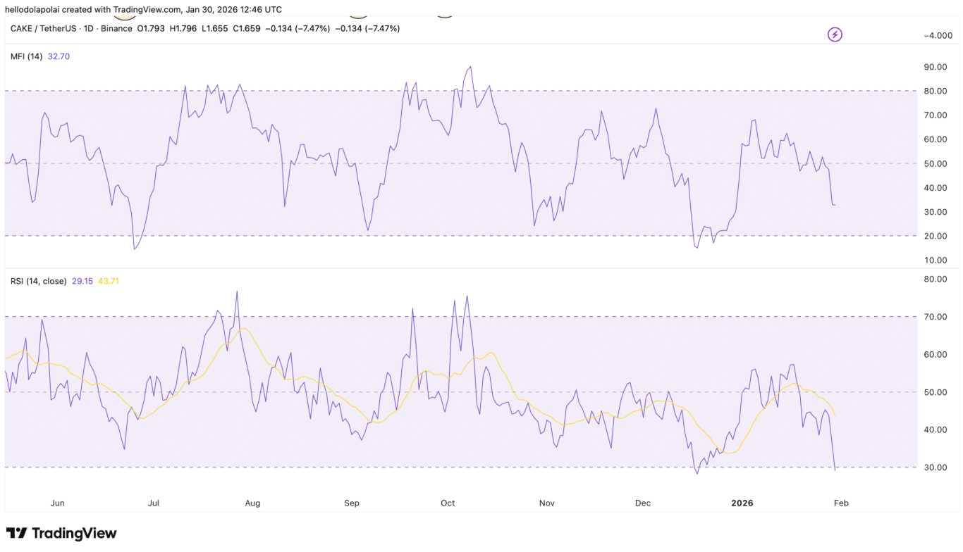 Ngược lại, RSI lại phát đi tín hiệu khác. Việc chỉ báo này trượt xuống dưới ngưỡng 30 cho thấy CAKE đang rơi vào vùng quá bán – khu vực thường gắn liền với khả năng xuất hiện các nhịp hồi kỹ thuật ngắn hạn, khi lực bán dần suy yếu và dòng tiền đầu cơ bắt đầu quay lại.