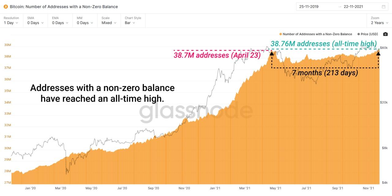 Trong khi đó, điều quan trọng cần lưu ý là số lượng địa chỉ Bitcoin có số dư khác 0 đang ở mức cao nhất mọi thời đại mới (38,76 triệu địa chỉ).