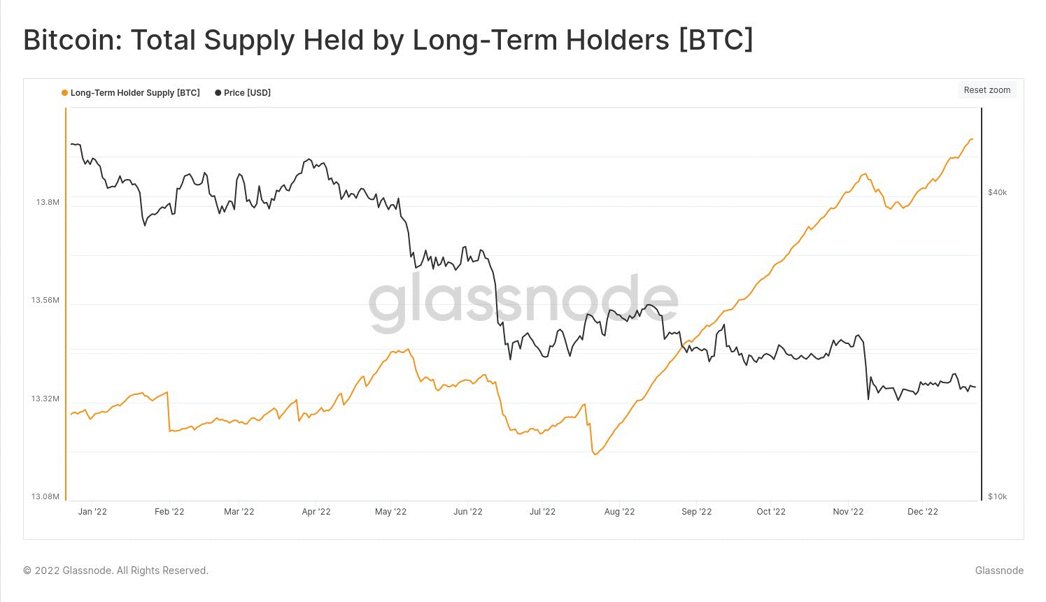 Tổng nguồn cung Bitcoin do người dùng dài hạn nắm giữ tăng trong suốt năm 2022. Nhưng điều đáng chú ý là nó đã chao đảo trong các sự kiện lớn như thất bại của Terra-LUNA vào tháng 5, quỹ phòng hộ Three Arrows Capital (3AC) phá sản vào tháng 6 và công ty cho vay tiền điện tử Celsius vào tháng 7, FTX sụp đổ vào tháng 11. Những sự kiện này đã gây ra tâm lý hoảng loạn ngắn hạn khiến holder dài hạn phải giảm lượng BTC nắm giữ của họ.