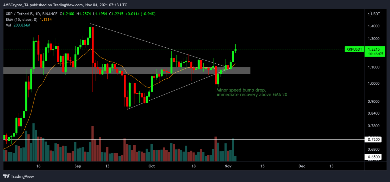 Tại thời điểm viết bài, sụt giảm có thể được coi là đang lấy đà vì giá phục hồi ngay lập tức và XRP tăng trên $1,1 trong vòng một tuần. Về mặt kỹ thuật, nến hàng ngày đóng trên đường trung bình động hàm mũ 20 (EMA-20) trong vòng 3 ngày, cho thấy động lực tăng mạnh.