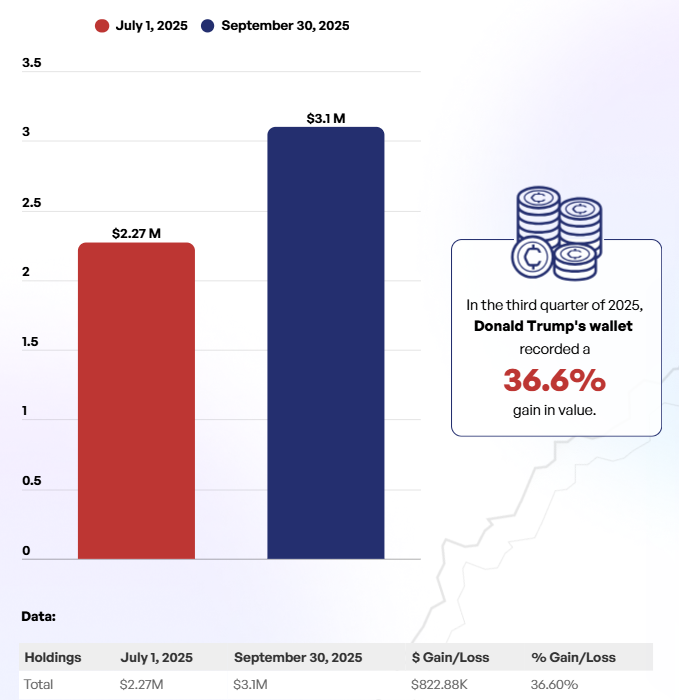 Ví tiền điện tử công khai liên kết với Tổng thống Donald Trump đã phục hồi đáng kể trong quý 3 năm 2025, tăng 36,6% từ 2,27 triệu USD lên 3,10 triệu USD. Dù vậy, danh mục vẫn giảm gần 70% kể từ đầu năm, sau những khoản lỗ lớn trước đó, bao gồm mức giảm 80,7% trong quý 1. Sự tăng trưởng quý 3 chủ yếu nhờ các khoản tiền gửi bất ngờ như airdrop token meme và các token liên quan đến Trump, cùng với sự bùng nổ các token theo chủ đề Trump nhờ truyền thông và các sự kiện quảng bá, chứ không phải do Trump trực tiếp quản lý. Ví chủ yếu nhận quyên góp và token đầu cơ, ít giao dịch chủ động.