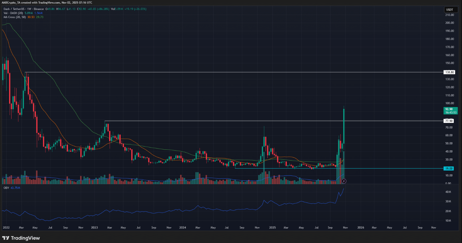 Nếu giá đóng nến tuần trên 77,9 USD, đó sẽ là tín hiệu xác nhận chắc chắn cho đà tăng tiếp diễn. Ngược lại, nếu DASH trượt xuống dưới mốc này, tâm lý thị trường có thể lung lay, mở ra khả năng xuất hiện một pha điều chỉnh hoặc đảo chiều giảm.
