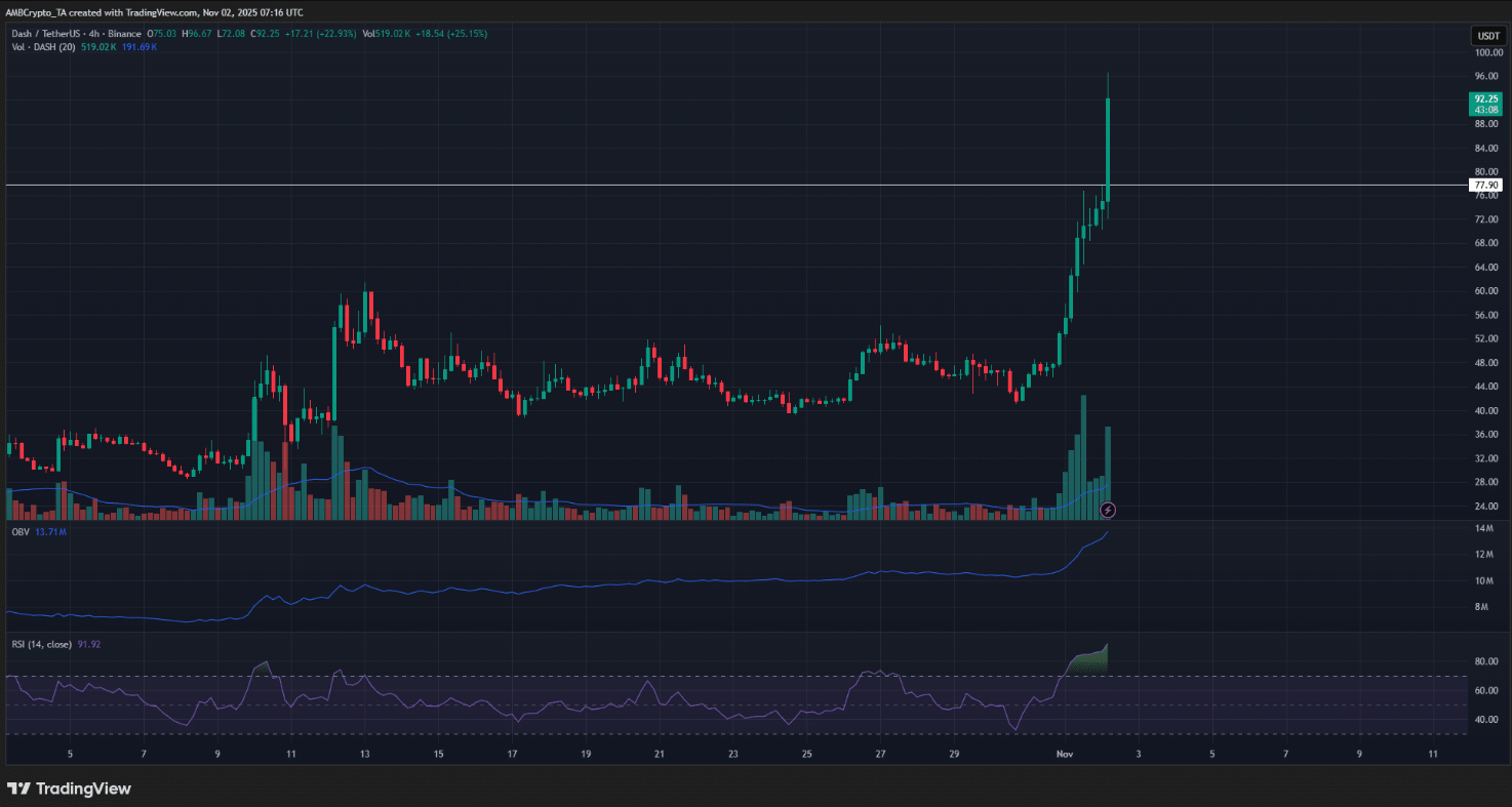 Dash (DASH) đã bứt phá ngoạn mục, tăng tới 49,7% chỉ trong 24 giờ, vượt qua ngưỡng kháng cự quan trọng 77,9 USD – mức được thiết lập từ đầu năm 2023. Đà tăng mạnh mẽ này diễn ra song song với cú bứt phá ấn tượng của ZCash (ZEC), khi đồng coin đạt đỉnh 449,8 USD, mức giá chưa từng thấy kể từ năm 2018.