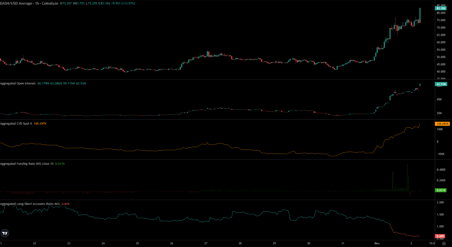 Khối lượng giao dịch sôi động suốt năm tuần liên tiếp, cộng hưởng cùng làn sóng quan tâm ngày càng lớn đối với các đồng coin chú trọng quyền riêng tư, cho thấy dòng tiền vẫn chưa hề có dấu hiệu chững lại. Dù DASH đang tiến vào vùng “quá mua” trong ngắn hạn, xu hướng chủ đạo vẫn nghiêng hẳn về phe bò.