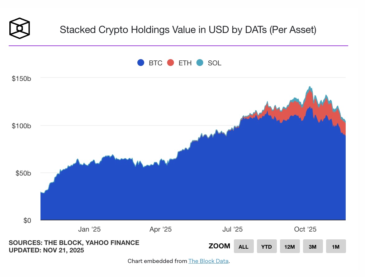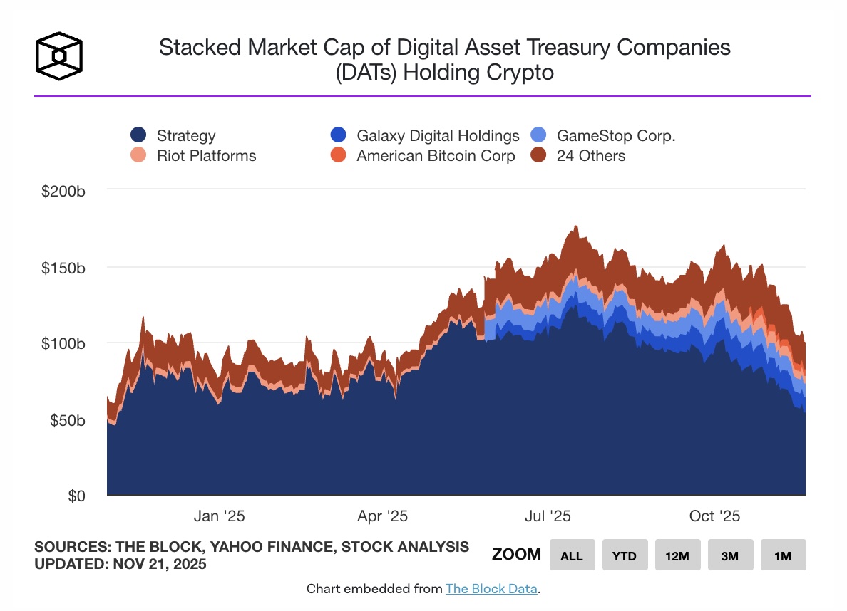 Sự sụt giảm giá cổ phiếu diễn ra trong bối cảnh tổng vốn hóa thị trường crypto tụt xuống dưới 2,9 nghìn tỷ USD lần đầu tiên kể từ tháng 5, chịu tác động từ dòng rút ETF tăng cao và tình hình kinh tế vĩ mô bất ổn. Trong khi đó, tổng giá trị crypto mà các DAT nắm giữ đã giảm từ 141 tỷ USD khi Bitcoin lập kỷ lục vào ngày 6/10 xuống còn 104 tỷ USD tính đến ngày 21/11.