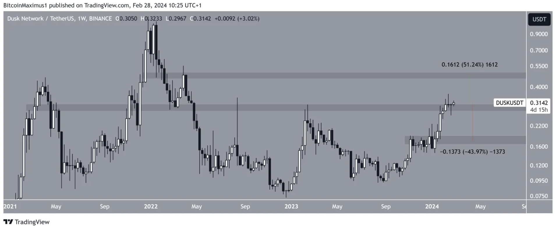 Biểu đồ DUSK/USDT hàng tuần | Nguồn: TradingView