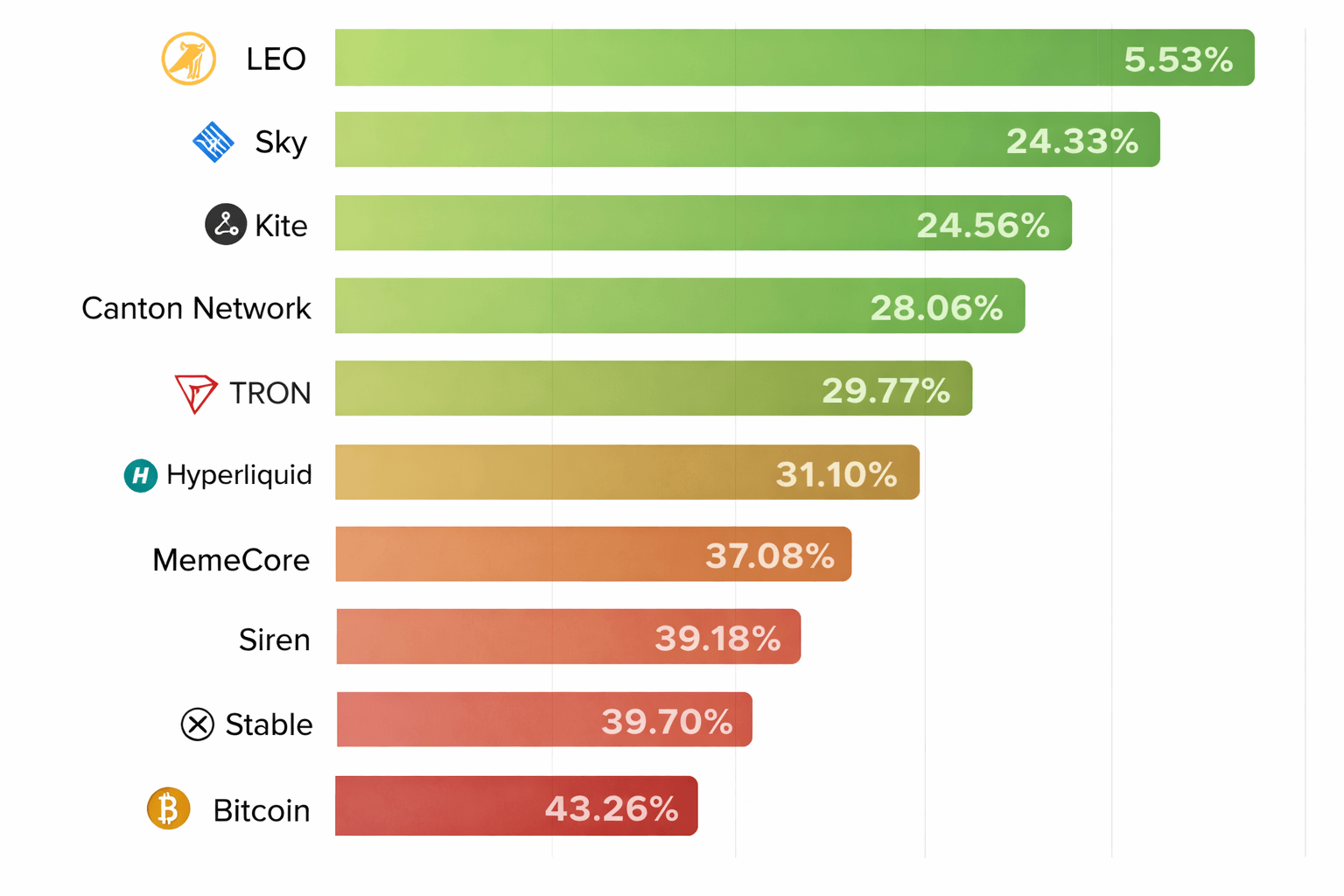 - Nhóm vượt trội rõ rệt: LEO; Sky, Kite, Canton Network, TRON, Hyperliquid vẫn giữ khoảng cách lớn so với baseline 43% của BTC.