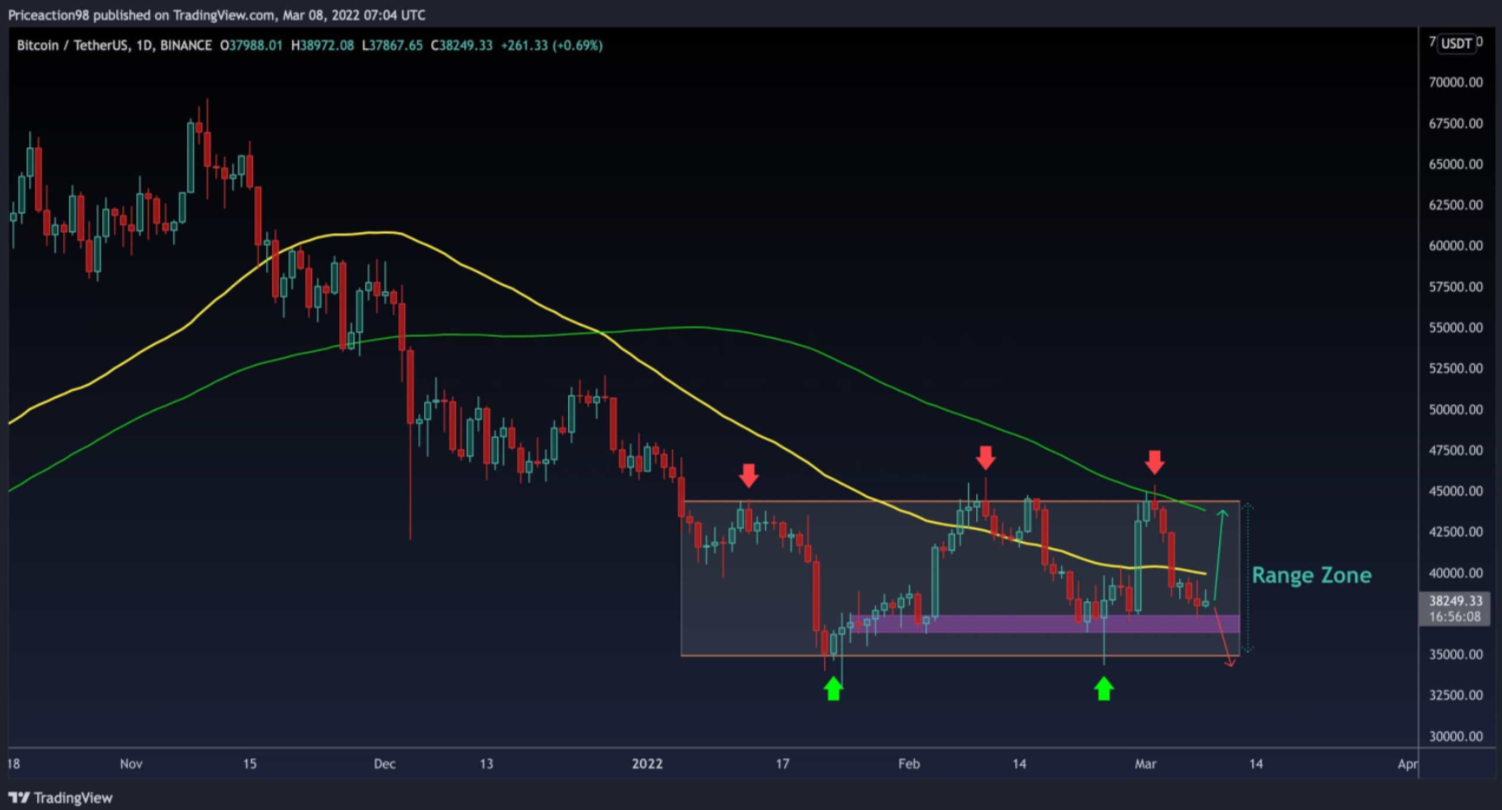 Giá đã không hình thành được cấu trúc tăng giá trong khung thời gian hàng ngày khi đỉnh của phạm vi và đường trung bình động 100 ngày đã từ chối nó. Hiện tại, Bitcoin đang ở trên vùng hỗ trợ quan trọng xung quanh $ 36,3K- $ 37,3K. Tiền điện tử cần duy trì vùng hỗ trợ đã đề cập để bắt đầu một đợt tăng khác lên đỉnh của phạm vi.