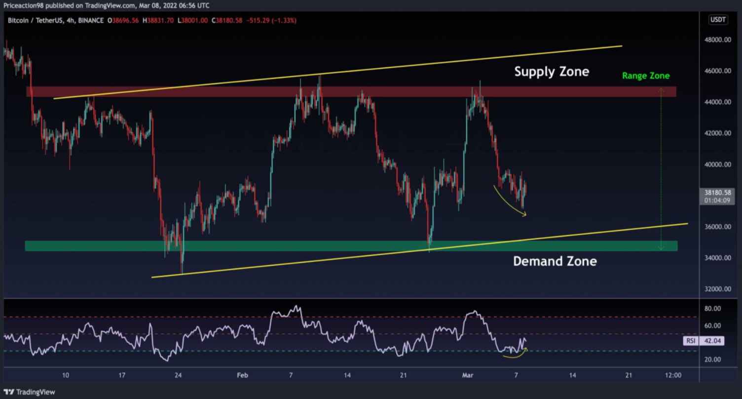 Biểu đồ 4 giờ cho thấy Bitcoin hiện đang hợp nhất giữa hai vùng cung và cầu. Mức kháng cự gần nhất là $ 45K, trong khi mức hỗ trợ mạnh là khoảng $ 34K.