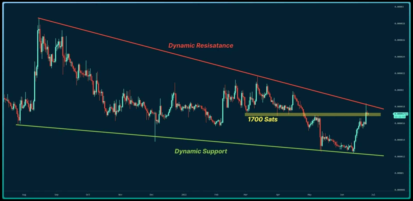 - Mức hỗ trợ chính: 1700 Sats & 1550 Sats