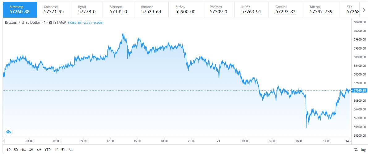 Giá Bitcoin có thời điểm giảm dưới 56.000 đô la vào ngày 21/3 sau nhiều lần bị mức kháng cự 60.000 đô la từ chối trong suốt 4 ngày qua. Vào thời điểm viết bài, BTC đang giao dịch quanh mức 57.260 đô la, giảm 3,3% trong 24 giờ.