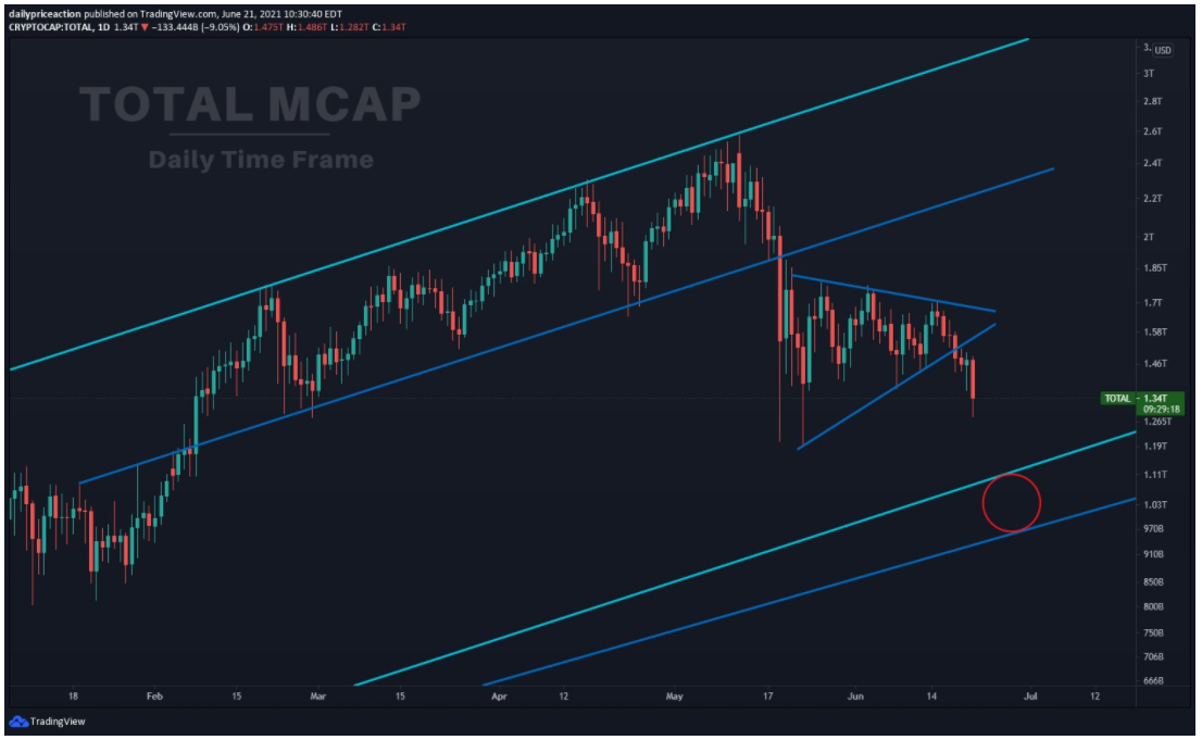 “Tổng vốn hóa thị trường đã phá vỡ xuống dưới một tam giác đối xứng. Một động thái di chuyển theo toàn bộ chiều dài của tam giác sẽ đưa nó về 950 tỷ đô la hoặc -30% so với mức giá hiện tại… Đó là những gì chỉ báo kỹ thuật thể hiện. Không có nghĩa là nó sẽ xảy ra”.
