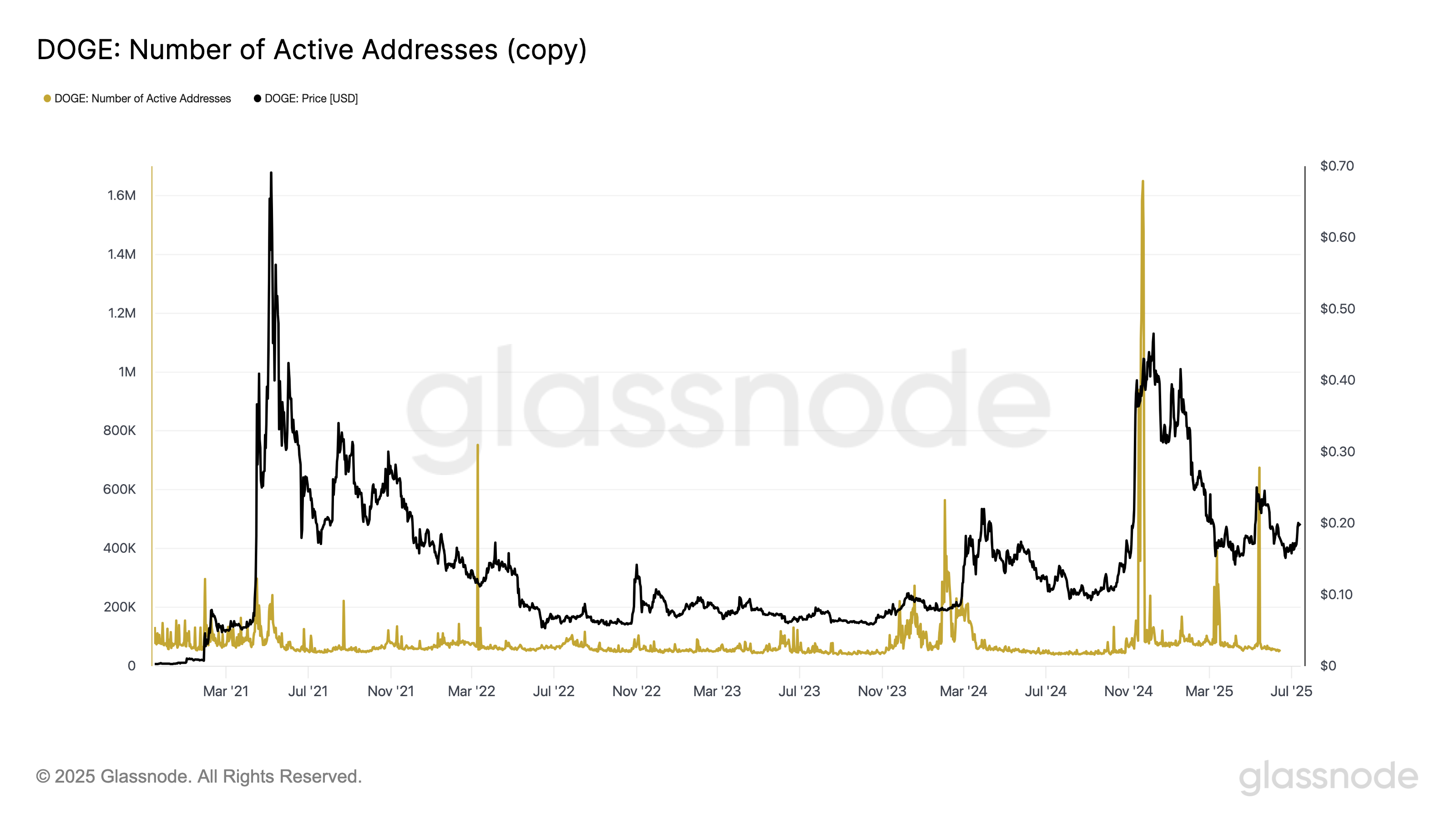 Dữ liệu từ Glassnode cũng chỉ ra rằng số lượng địa chỉ DOGE hoạt động đạt 68.268 vào ngày 14 tháng 7. Mặc dù không đạt đỉnh cao như trong các chu kỳ thị trường trước, sự gia tăng đột biến này cho thấy người dùng đang chú ý nhiều hơn đến Dogecoin, đặc biệt sau những biến động giá đáng kể.